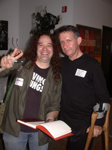 blonde hair, white t-shirt), Tom Stovall (shaved head, dark jacket)