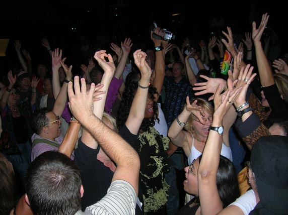 in front), Robin McNamara (tie dye), Dennis Brown (red shirt, arms in air),