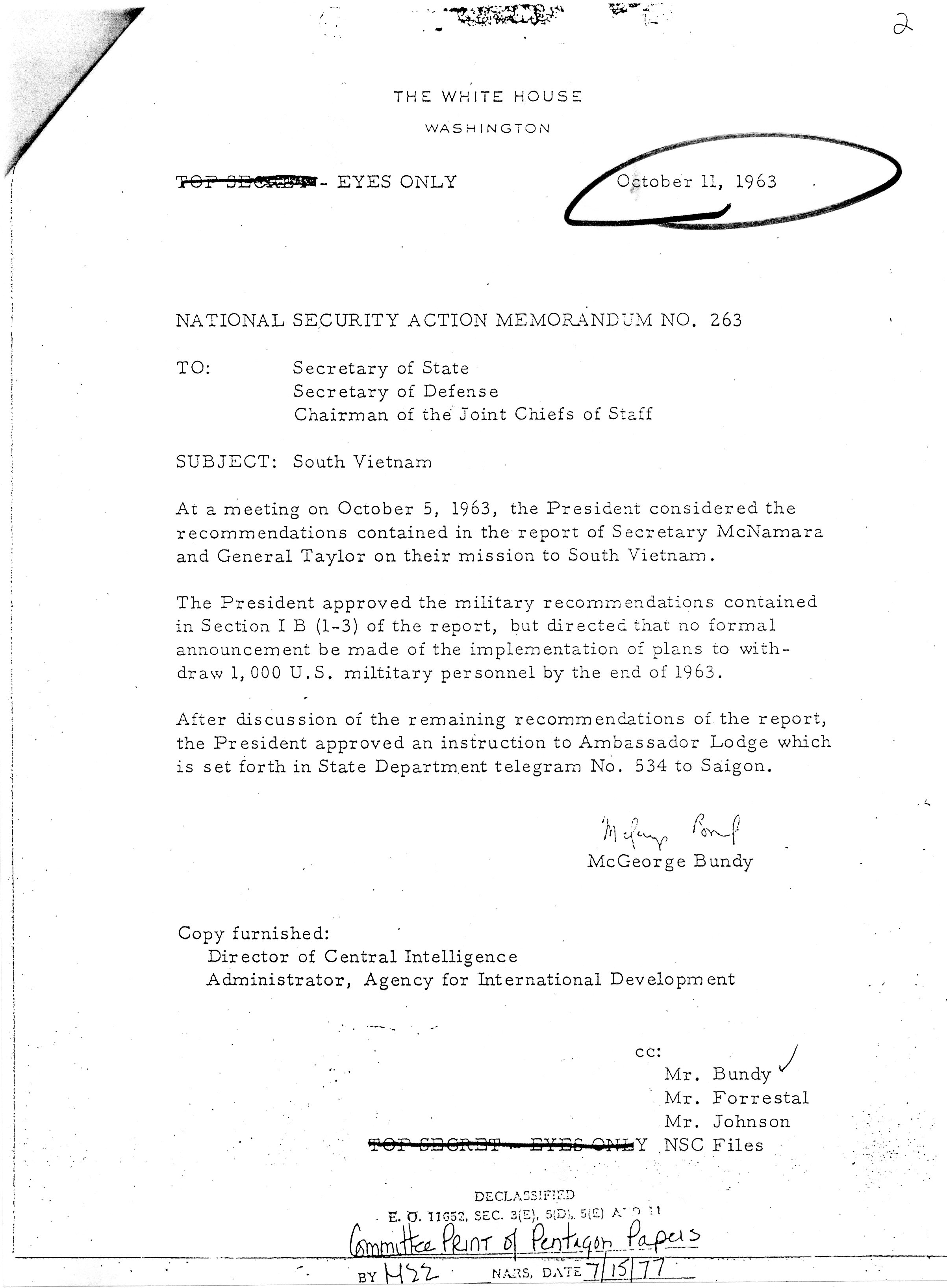 NATIONAL SECURITY ACTION MEMORANDUM NO. 263, was issued on October 11, 1963.